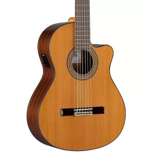 It has an elegant solid cedar top, beautifully finished cutaway, and the built-in Fishman Classic II system is especially dedicated for nylon string guitars are just some of the apointments that make this a great guitar. The 3 C CW is built with the steel-string guitar player partially in mind as it has a slightly narrower neck width than the standard for classical models.