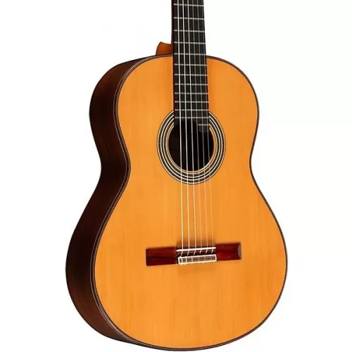 The Alhambra Línea Profesional classical guitar offers reliability and comfort, designed for musicians seeking to ever improve their skills with a high-quality instrument. It is a balanced guitar that transmits purity in the sound, as well as power, color and projection. The Línea Profesional has a solid cedar top with Indian rosewood back and sides, producing warmth, richness and clarity. The cedar neck is constructed by the Alhambra luthiers to satisfy the demands of any player, shaped in an Ergoneck profile for great feel and playability. It features an asymmetric layout of the harmonic bars, providing an adequate hardness, as well as the projection required by a concert instrument. Additional appointments to the Línea Profesional include Schaller Grand Tune Classic tuners, a bone saddle and nut, and a gloss nitro finish.