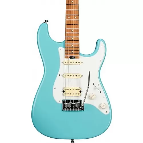 A classic beauty, the MJ Series Signature Misha Mansoor So-Cal 2PT electric guitar comes in Daphne Blue with color-matched licensed Fender Strat headstock, white pickguard, parchment skirt-style control knobs and chrome hardware.